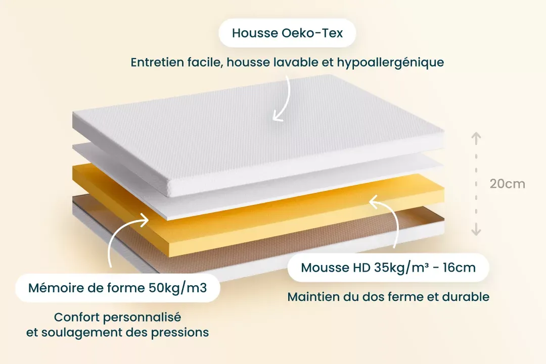 - Double couche de mousse : 3 cm de mémoire de forme pour un accueil cocooning et 17 cm de mousse haute densité (35 kg/m³) pour un soutien ferme et durable.